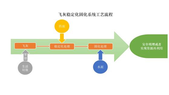 實現(xiàn)手段:“飛灰+螯合劑+水+水泥”進(jìn)行混合攪拌,根據(jù)項目特點設(shè)定具體的配比值和附加工藝,可設(shè)置多條生產(chǎn)線組合的生產(chǎn)工藝,以滿足飛灰產(chǎn)生量比較大的項目。